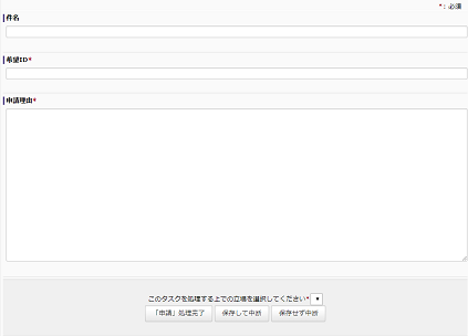 2.での設定を反映したタスク「申請」の実行画面は、左図のようになります。 この画面は、[フォームプレビュー]で確認することができます。 |
