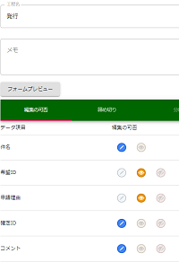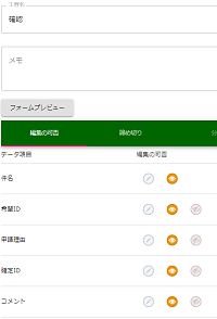 タスク「申請」では、申請者は、[希望ID]と[申請理由]を入力しますので、これらのデータ項目で[編集可]アイコンを選択します。 [確定ID]、[コメント]については、このタスクにおいて不要なので、[表示なし]アイコンを選択します。 変更後、 を押下します。