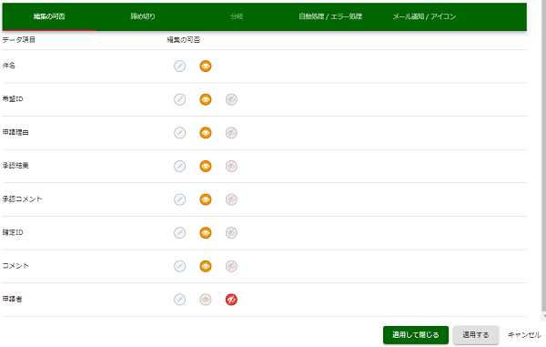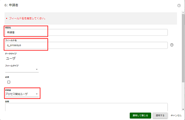 「確認」タスクにおいて、「申請者」を「表示なし」に変更します。 同様に、すべてのタスクで「申請者」を「表示なし」に指定します。 画面に表示したい場合は、「表示のみ」を設定してください。