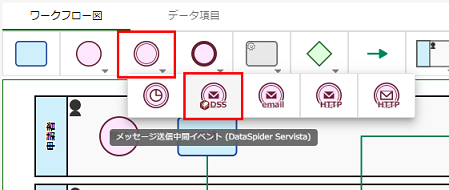 パレットから[中間イベント]を選択し、表示されるリストから[メッセージ送信中間イベント(DataSpider Servista)] |
