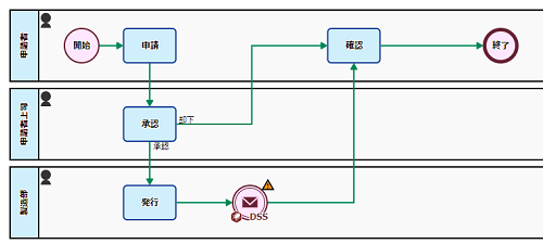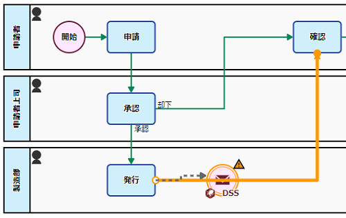 「発行」タスク → 「確認」タスクへのフローを、「発行」タスク → [メッセージ送信中間イベント(DataSpider Servista)] 続けて、パレットから「フロー」を選択し、[メッセージ送信中間イベント(DataSpider Servista)] |