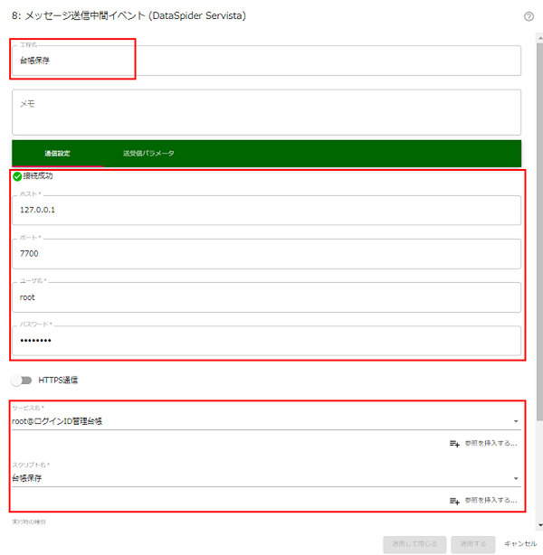 使用するDataSpider Servistaの設定により、適宜編集してください。 設定が正しい場合は、「接続成功」を表示します。