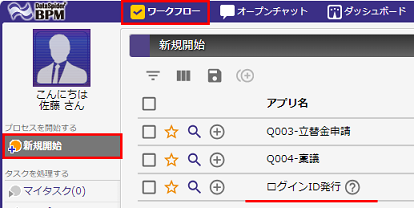 [ワークフロー]の[新規開始]にて、新しい「ログインID発行」アプリを開始することができます。 (説明)