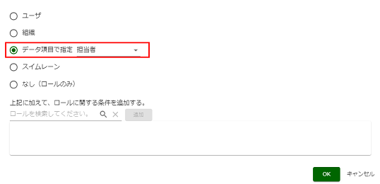 処理担当者が「データ項目が「担当者」で指定されているユーザ」になるように変更します。 [編集]を押下します。 [データ項目で指定]をチェックし、[担当者]を選択します。 (説明)