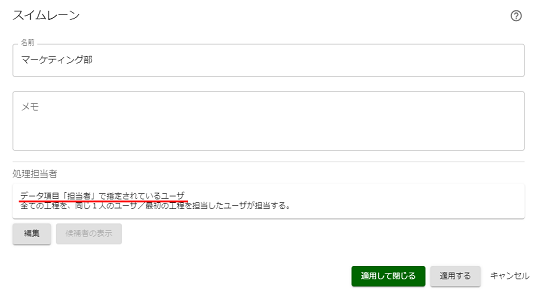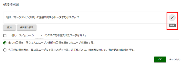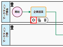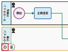 スイムレーン「マーケティング部」を押下し、表示されたメニューの[歯車]アイコンを押下します。 処理担当者の[編集]を押下します。 |