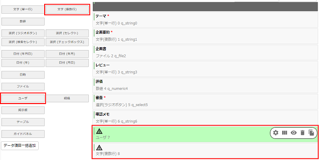 画面左側の選択ボックスの中から、「ユーザ」、「文字(複数行)」を選択します。 新しく追加したデータ項目の設定を、それぞれ下表のように変更します。