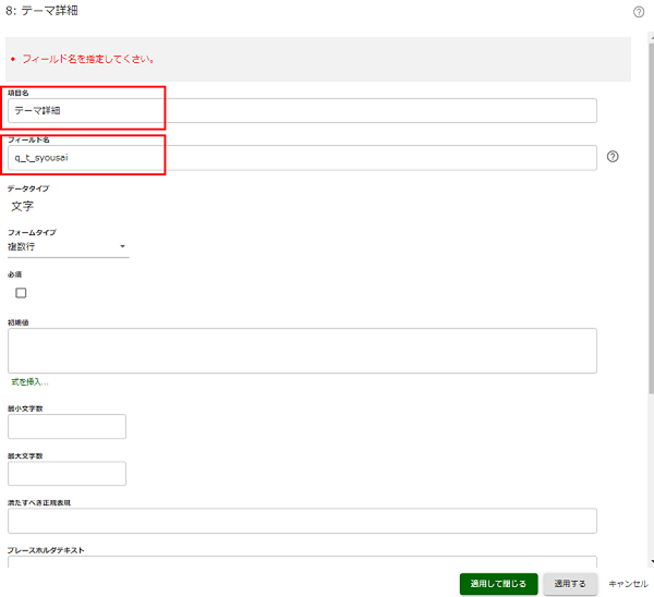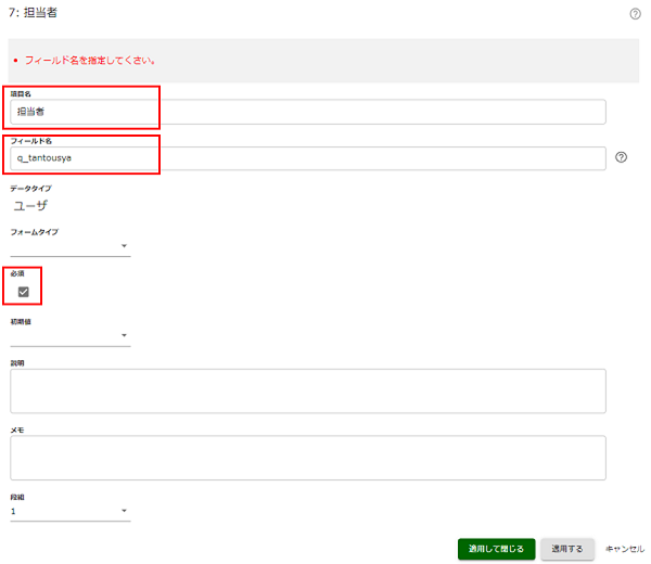 新しく追加したデータ項目について、次のように設定します。