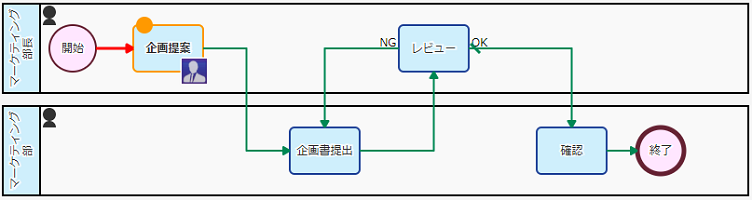 伊藤さんは企画書のテーマを決定し、マーケティング部メンバ全員に企画書作成を依頼しました。[ステップ1: プロセスを開始する] << ... >> [ステップ3: タスクを引き受ける]