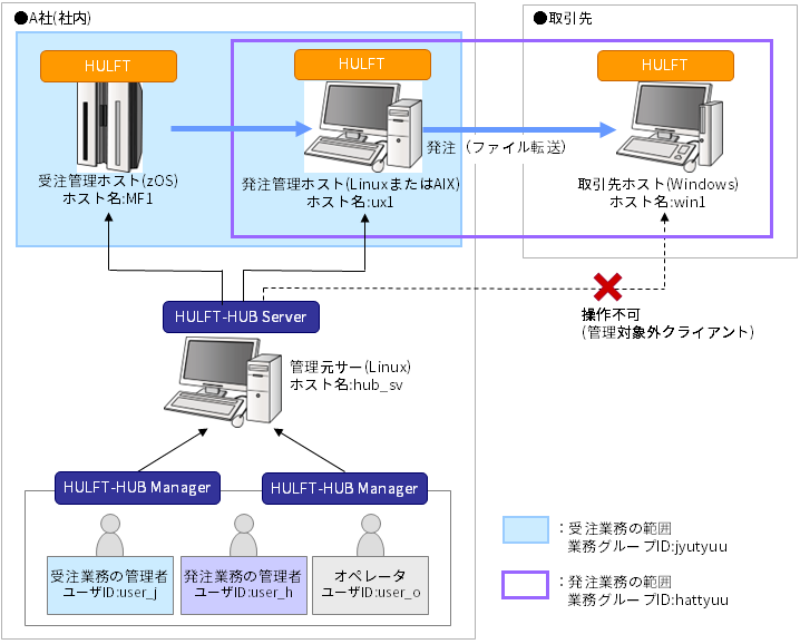 「既存の環境へHULFT-HUBシステムを導入する」以降では、図に示した業務イメージを実現するための、HULFT-HUBシステムの導入手順を説明します。