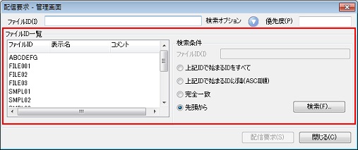 以下の要求発行でファイルIDまたはホスト名を検索する操作を説明します。配信要求でファイルIDを検索する場合を例に説明しますが、他の場合も同様の操作です。