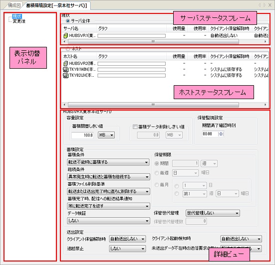 | サーバステータスフレーム | 構成リストまたは構成図で選択したサーバが、使用量・使用率と共に表示されます。ここで選択したサーバの蓄積環境設定が、詳細ビューに表示されます。 |