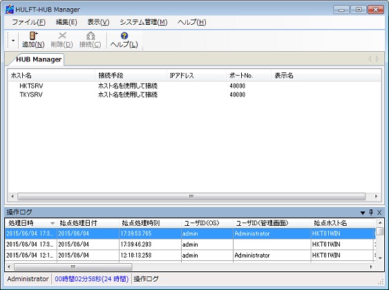 HULFT-HUB Managerメイン画面の[システム管理]メニューの[操作ログ]をクリックすると、操作ログ一覧が表示されます。