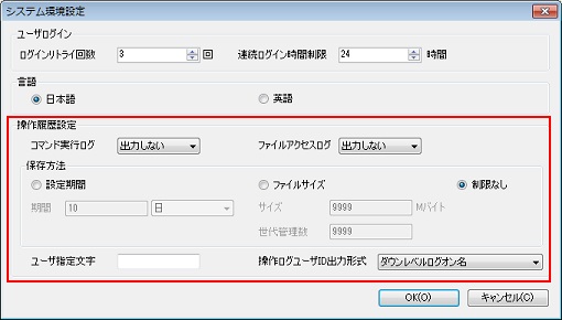 操作ログ(コマンド実行ログとファイルアクセスログ)の出力有無や保存方法を設定します。