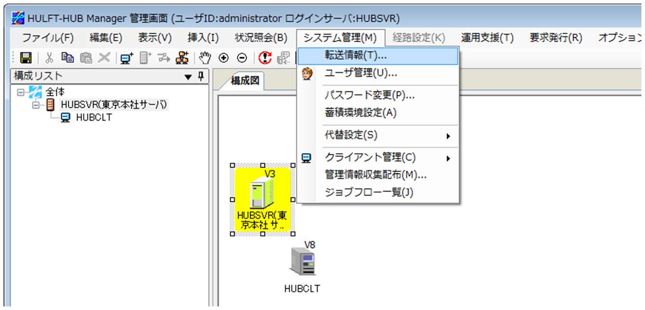 構成図でHUBSVRのアイコンを選択し、システム管理メニューの転送情報をクリックしてください。