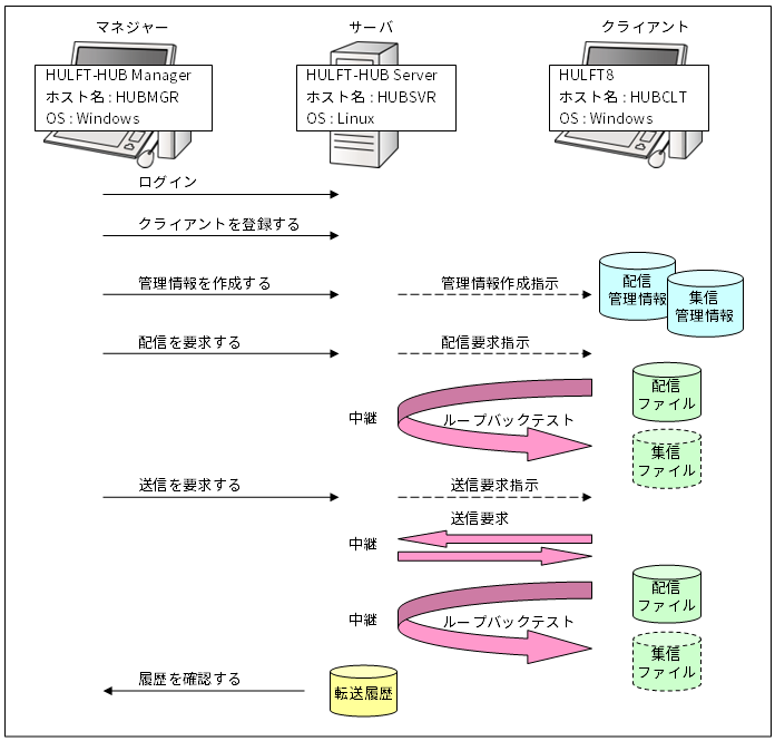 HULFT-HUB Serverを含むHULFT-HUBシステムのインストールが正常に終了したかどうかの確認を行うために、基本的な動作テストを「HULFT-HUB Server:1台」「HULFT-HUB Manager:1台」「クライアント:1台」の最小構成で行います。