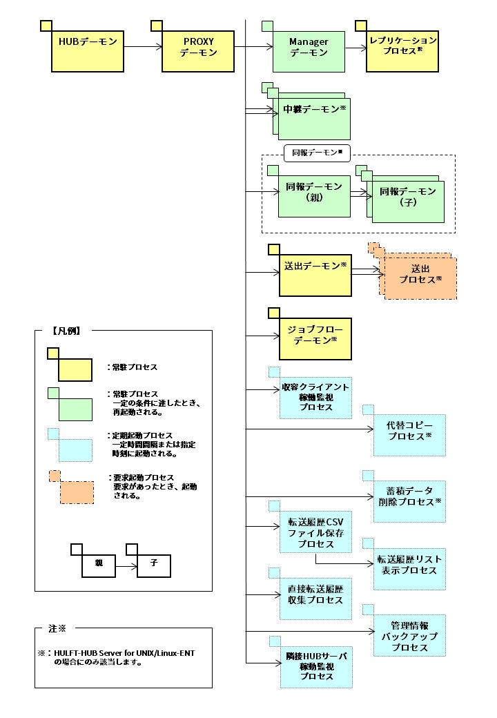 HULFT-HUB Managerとの接続がすべて解除された場合に、PROXYデーモンによって新たなプロセスが生成され、それ以前のプロセスは消滅します。このため、Managerデーモンは、一時的に複数同時に存在、または存在しない場合があります。 |