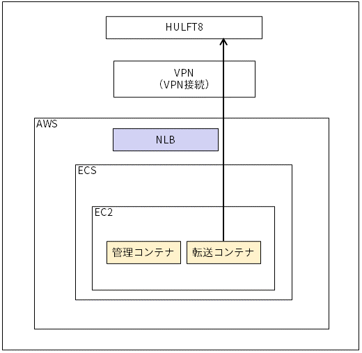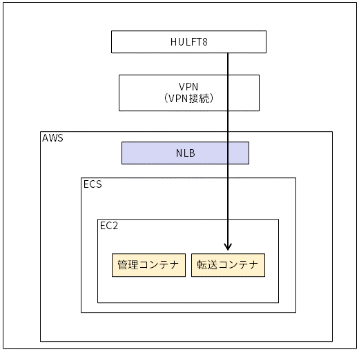 HULFT8からHULFT10の管理コンテナへの接続には、以下のようにオンプレミス環境にあるHULFT8からNetwork Load Balancer(以降、NLB)を経由して転送コンテナにつながります。