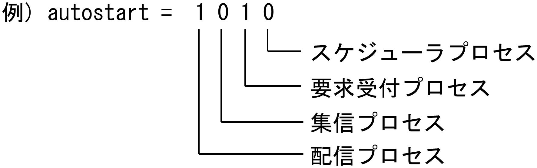 どのプロセスを起動するかは、プロセスごとに指定可能で、4桁に“0”または“1”で指定します。“1”を指定した場合には自動起動を行い、“0”を指定した場合には自動起動は行いません。数値は左から「配信プロセス」、「集信プロセス」、「要求受付プロセス」、「スケジューラプロセス」です。