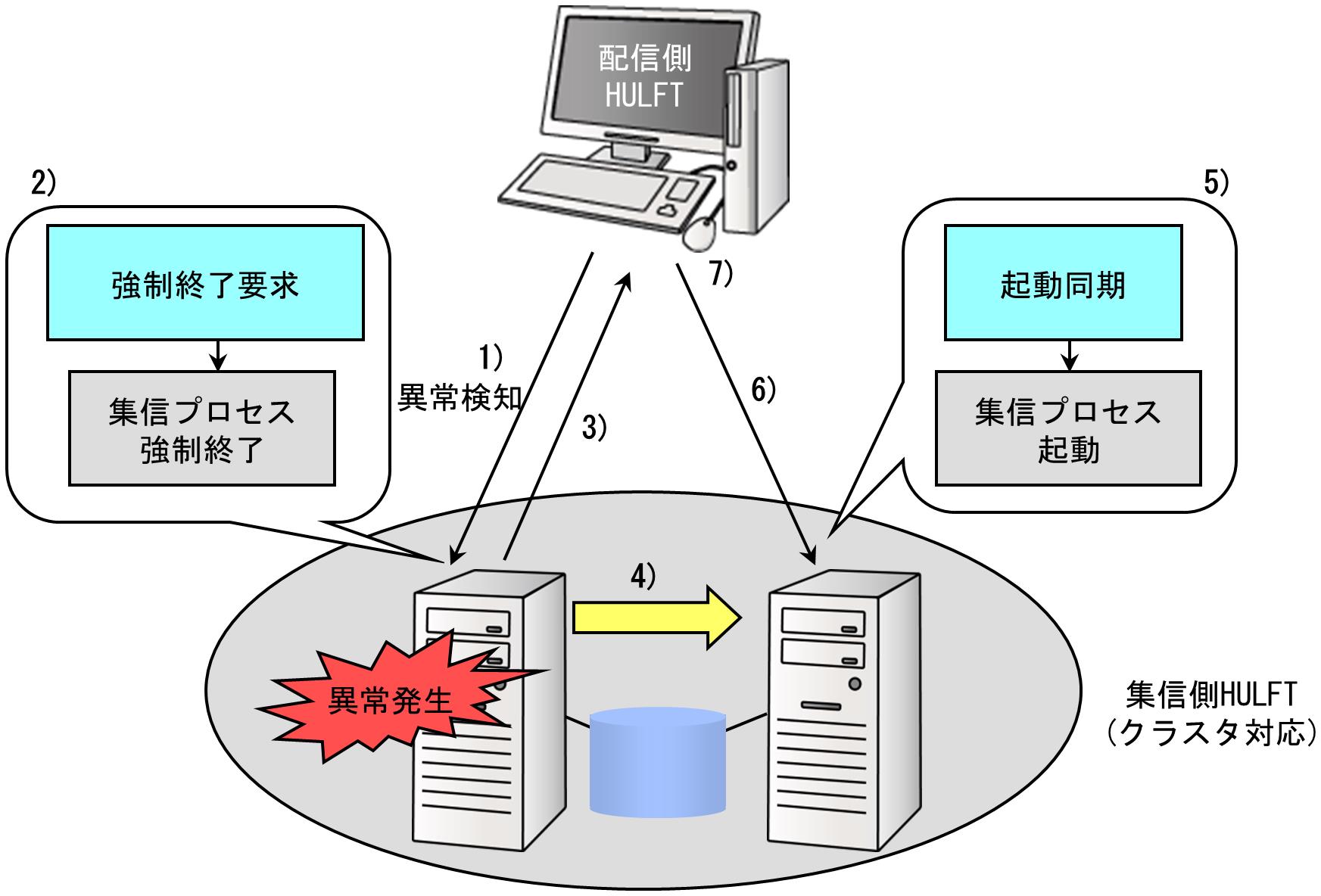 集信中(データ転送中)にフェールオーバーが発生した場合、切り替わった待機系ノードで自動再配信します。集信側HULFTは、配信側HULFTに自動再配信を行うように通知します。集信側がフェールオーバーした場合の自動再配信の対象となるのは、強制終了で集信が異常終了した場合です。