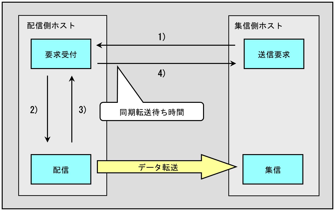 同期転送の場合、配信システムがファイル転送を終了するまで、配信要求コマンドは待ち状態になります。