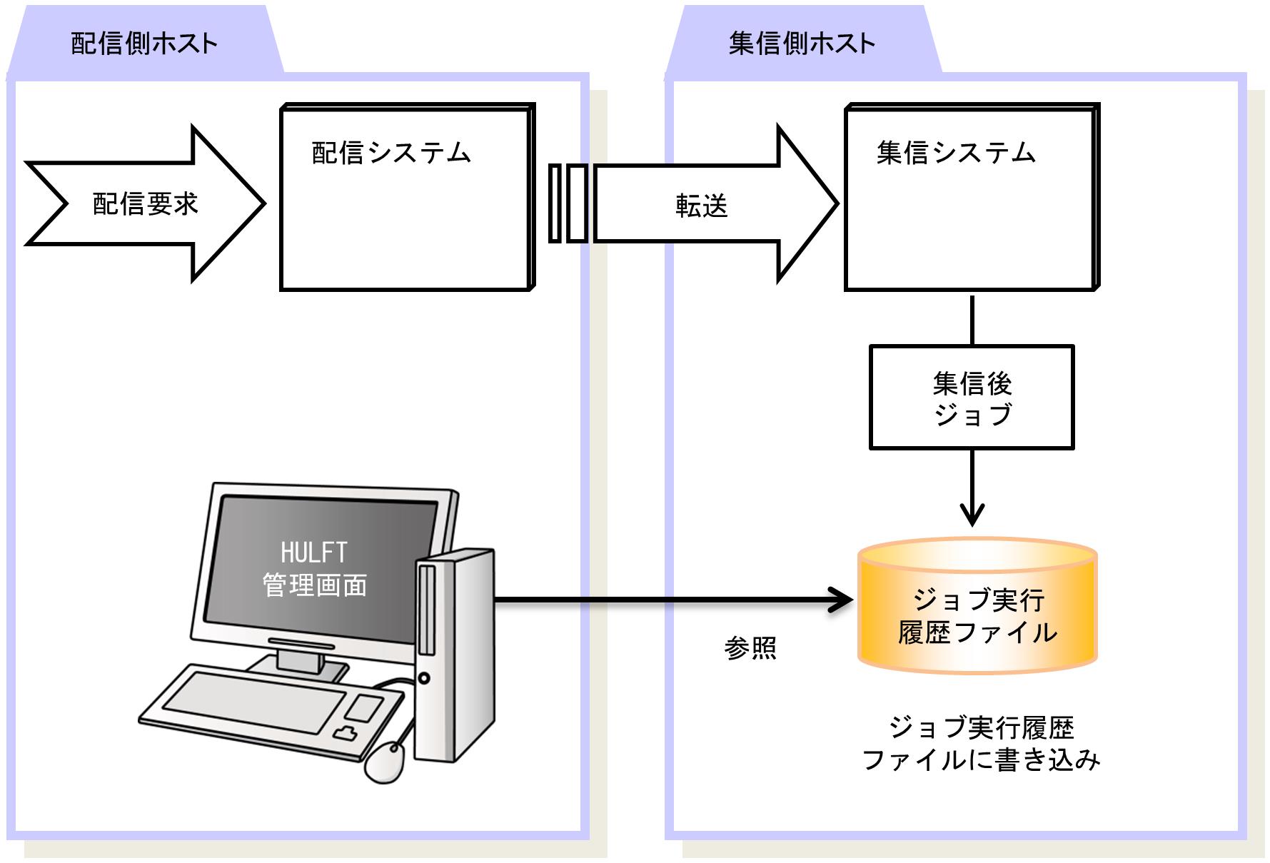 集信側ホストの集信後ジョブの実行履歴を、配信側ホストのHULFT管理画面で確認できます。この機能を「集信後ジョブ結果参照要求」といいます。集信後ジョブの実行履歴は、配信側ホストの配信詳細情報画面で確認します。