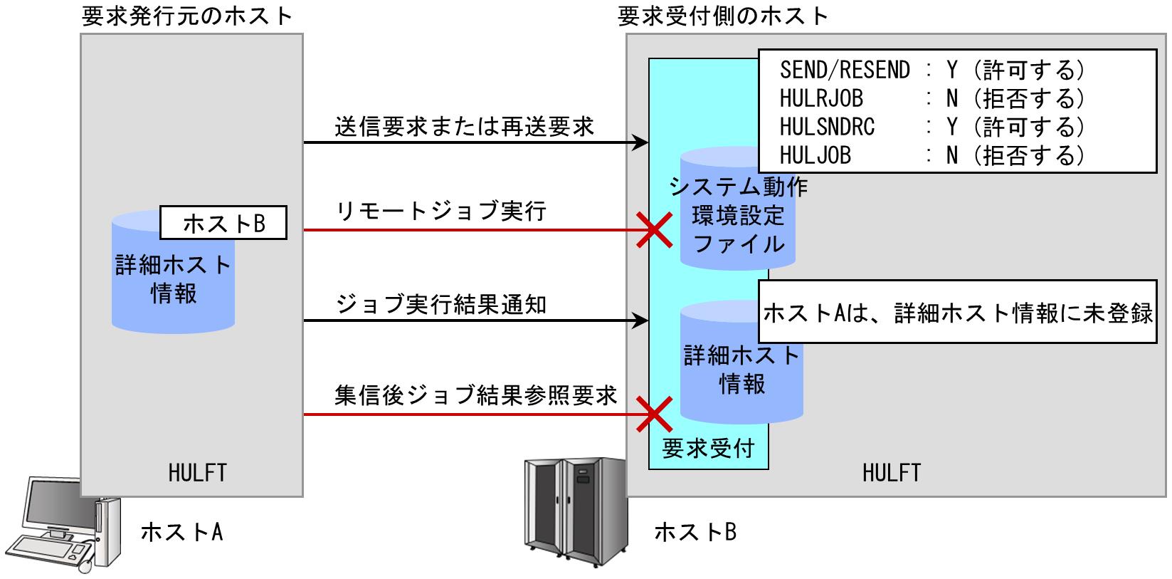 システムの運用時、システム動作環境設定で“N”を指定したサービスの要求は拒否され、エラーとして処理されます。図2.43 に示した例では、リモートジョブ実行(HULRJOB)および集信後ジョブ結果参照要求(HULJOB)のサービスに対して、接続を拒否しています。