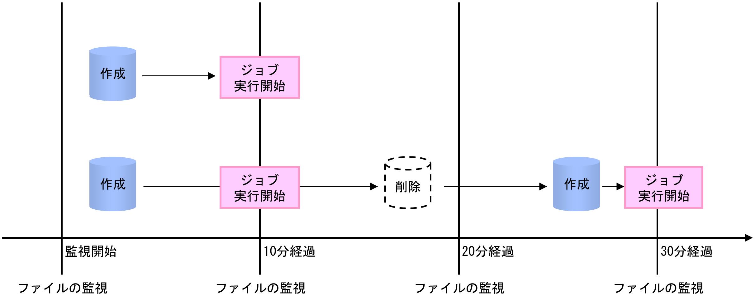 ファイルの削除を監視する場合のジョブ実行のタイミングを以下の図に示します。