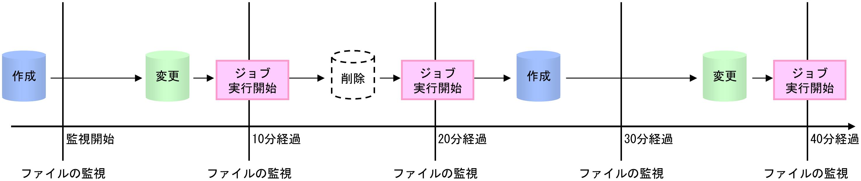 ファイルの変更を監視する場合のジョブ実行のタイミングを以下の図に示します。