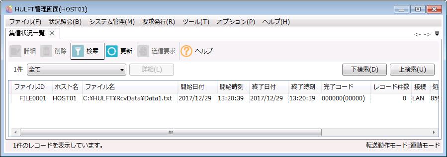 HULFT管理画面の状況照会-集信状況照会をクリックします。集信状況一覧画面が表示されます。