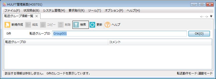 HULFT管理画面のシステム管理-転送グループ情報をクリックします。転送グループ情報一覧画面が表示されます。