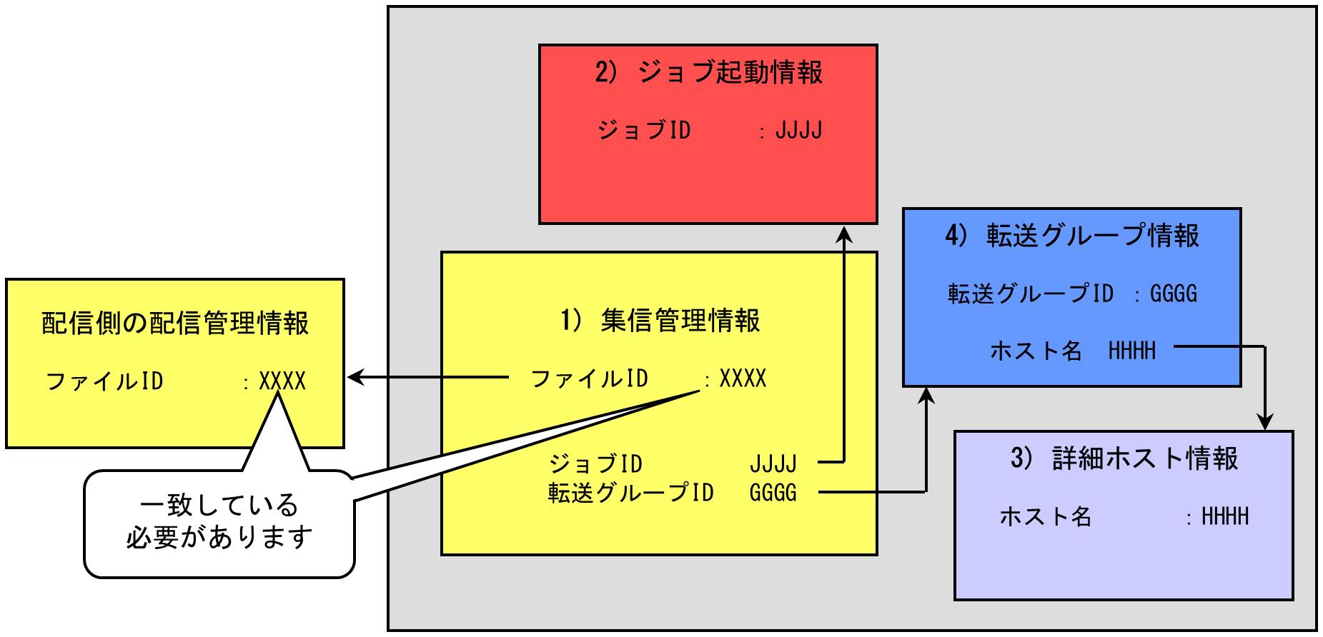 集信業務の管理情報の中で、中心となる情報です。集信側ホストの集信管理情報のファイルIDは、配信側ホストの配信管理情報のファイルIDと対応させて登録する必要があります。集信管理情報には、集信ファイルの属性や転送条件などの集信処理に必要な情報を登録します。
