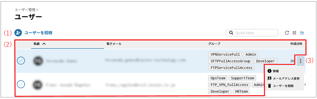 ユーザーページでは、管理者がユーザーの招待や削除などを行って、ユーザーを管理します。