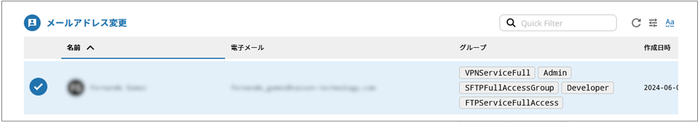このページでは、HULFT Squareユーザーのリストと各ユーザーの詳細情報が表示されます。個人設定の変更や、メールアドレスの変更ができます。