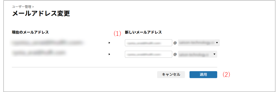 にチェックを入れると、(1)のボタンがメールアドレス変更になります。選択したユーザーのメールアドレスを一括で変更できます。メールアドレス変更を選択すると、「ユーザー管理 > メールアドレス変更」が表示されます。