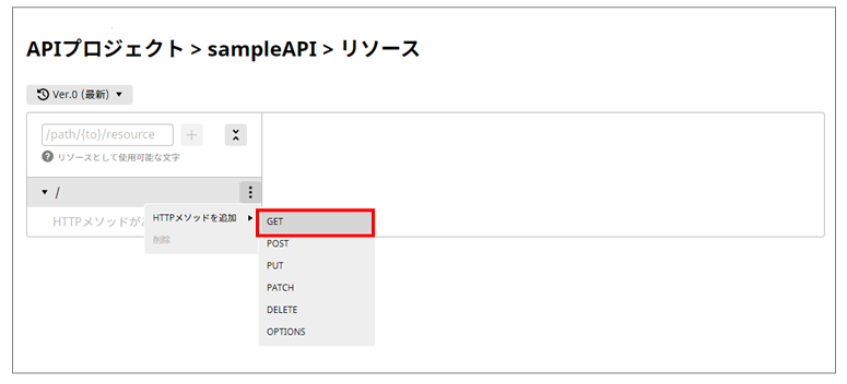 APIプロジェクト > sampleAPI > リソースページの右レイヤーで、以下のとおり設定し、Applyを選択します。