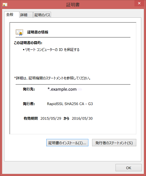 Javaのcacertsキーストアファイルは、5つのVeriSignルートCA証明書を含んでいるため、VeriSignの証明書を信頼できる証明書としてキーストア内にインポートする必要はないかもしれません。 ただし、ほかのCAに対して署名付き証明書を要求していて、このCAの公開鍵を認証する証明書がcacertsにまだ追加されていない場合は、該当するCAからの証明書を「信頼できる証明書」としてインポートする必要があります。