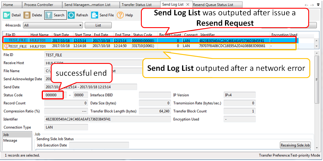The send process ends abnormally, and information about the resend (Resend Queue Status List) was outputed.