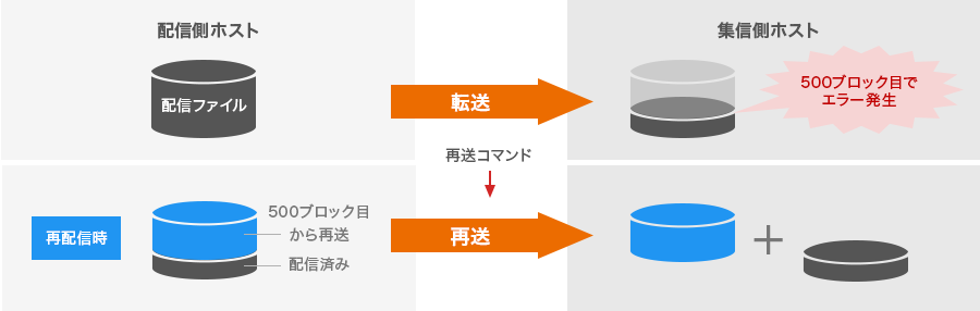 データ転送に異常が起きた後に、再配信要求により転送は異常箇所から再開します。