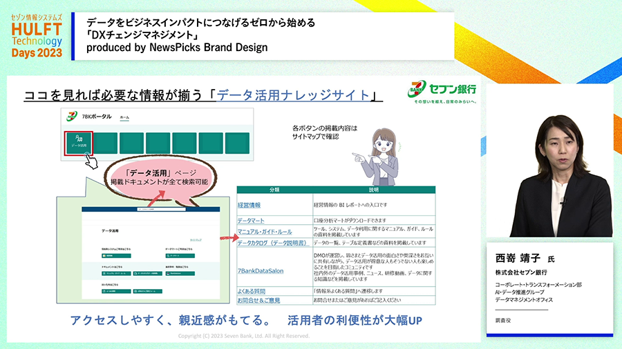 そして最後にセブン銀行での取り組みです。DXで成果を出すため、成果を出す種に気がついてもらうために、ニュースなど世の中の変化や新技術に触れてもらうようにしているとのこと。および意識改革や、手厚い内製研修制度による体系的にまとめた研修でデータスキルの向上に取り組んでいるとのことでした。BIレポートへのリンクや、データがある場所へのリンクと説明、解らないことを調べる方法など、データ活用に取り組みやすい情報を集めた社内ポータルも整備しているとのこと。