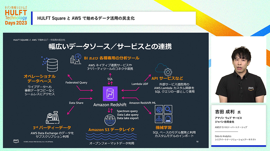 AWSのサービスと弊社HULFT Squareを組み合わせてデータ活用基盤を実現する方法について紹介を頂きました。