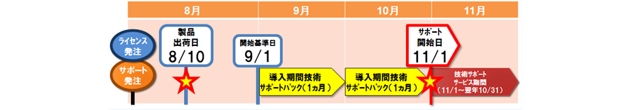 • 技術サポートサービス開始日を開始基準日以降に設定をしたい場合、「導入期間技術サポートサービスパック」をご利用いただくことで、必要な月数分(1ヵ月単位)の技術サポートサービスを追加することができます。